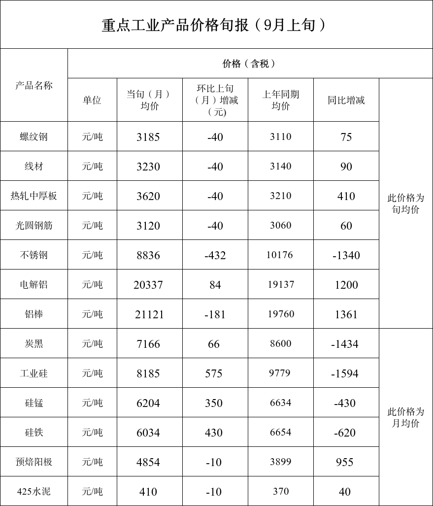 重点工业产品价格旬报(9月上旬)