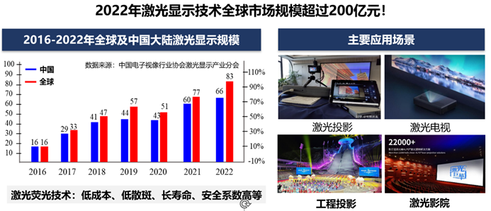 荧光转换型激光显示技术具有大尺寸、高清、高亮度等优点,现已发展成为激光显示国际主流技术,在家用显示、激光影院和工程投影等领域具有广泛应用,2022年全球市场规模超过200亿元。该技术主要采用蓝色激光远程激发荧光材料,其中发光材料和器件结构是激光荧光显示技术的核心,随着超高色域荧光转换型激光显示的应用需求,对高色纯度、高亮度稀土红色和绿色发光材料及优异的器件结构提出了更高的要求。