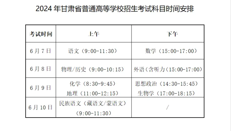 6月5日,甘肃省教育考试院发布的《2024年甘肃省普通高等学校招生工作规定》明确,普通高考将于6月7日至10日进行,高考成绩于6月25日左右公布。全省各批次各类别录取分数线一次确定,一次公布。第一次志愿填报时间为6月26日20:00至6月30日14:00,第二次填报时间为7月29日20:00至7月31日14:00。普通高考录取7月6日开始,8月15日结束。