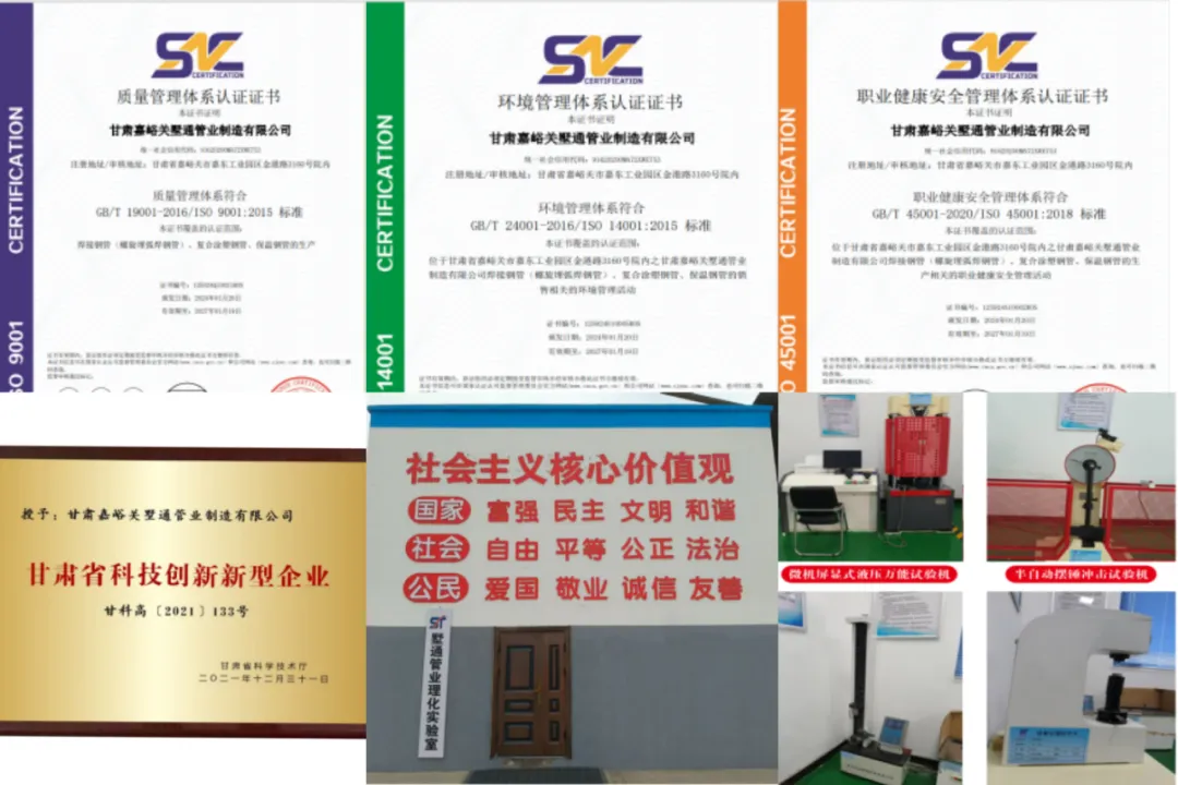 公司坚定不移推进“技术创新战略”:拥有螺旋钢管、保温管、3PE防腐钢管等核心产品的15项实用新型专利;设立专业检测中心,配备100余台精密仪器,实现超声波探伤、X射线工业电视全自动检测;获评国家高新技术企业、甘肃省科技创新型企业,质量管理通过ISO三体系认证(质量、环境、职业健康安全)。