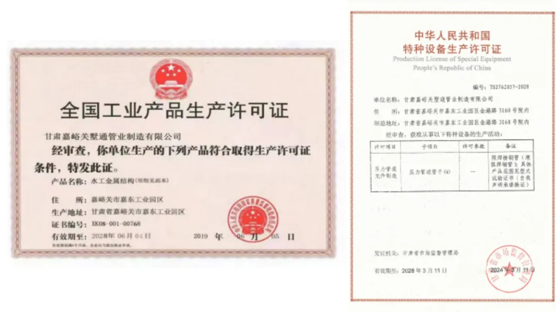 墅通管业以严苛标准筑牢质量防线,斩获多项国家级准入资质:全国工业产品(水工金属结构)生产许可证、压力管道元件制造特种设备许可证、甘肃省饮用水卫生安全批件等彰显其在重大工程领域的“硬通行证”。