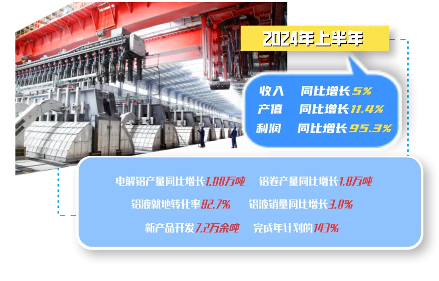 上半年,东兴铝业公司电解铝、铝卷产量分别同比增长1.08万吨、1.8万吨,收入同比增长5%,工业总产值同比增长11.4%,利润同比增长95.3%。