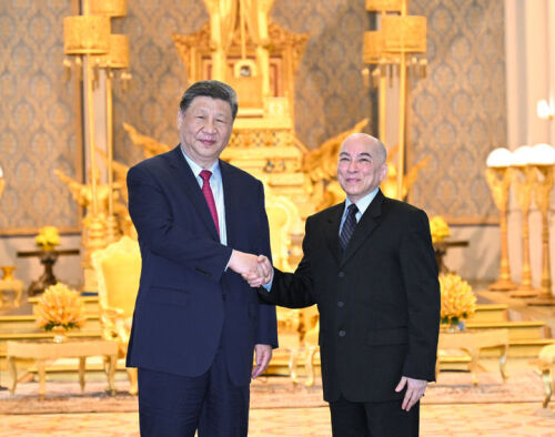 4月17日下午,柬埔寨国王西哈莫尼同中国国家主席习近平在金边王宫举行会见。这是会见后,两国元首步出金边王宫。新华社记者 殷博古 摄