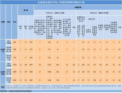 8月8日,甘肃省纪委监委公布了2025年7月全省查处违反中央八项规定精神问题汇总情况。当月,全省共查处违反中央八项规定精神问题605起,批评教育和处理988人,其中党纪政务处分393人。