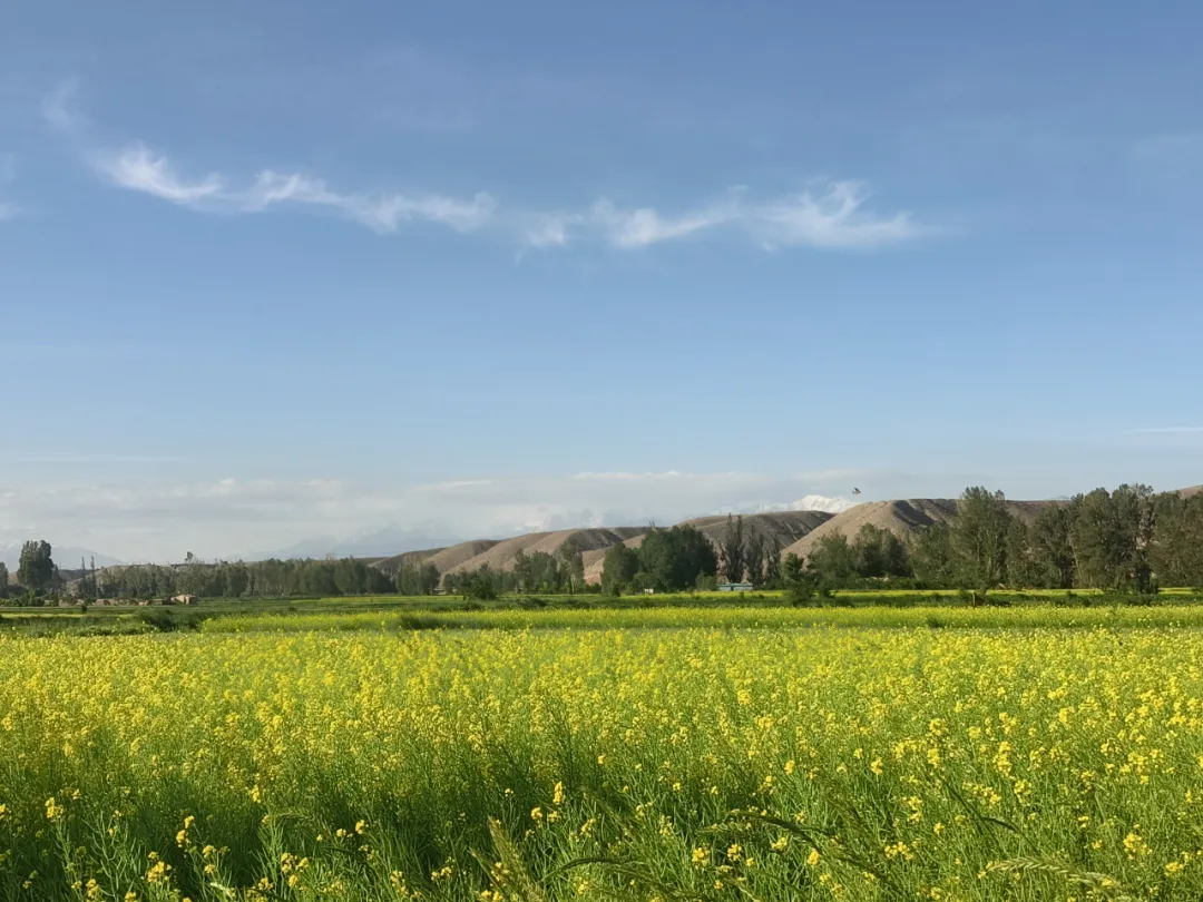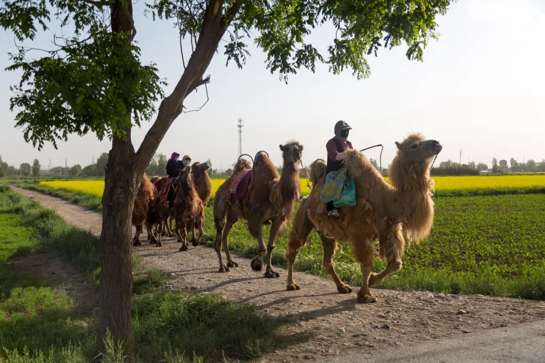 近日,峪泉镇嘉峪关村的百亩油菜花盛开,过往的驼队在田野间行进,与“金色画卷”形成一道亮丽的风景。