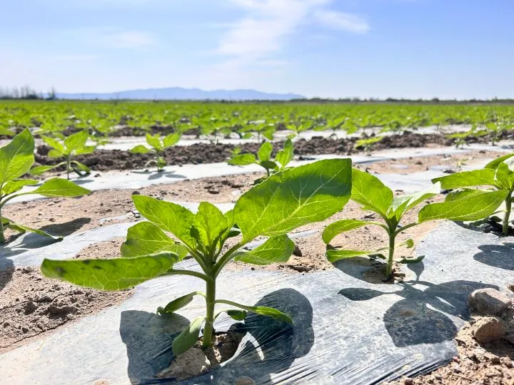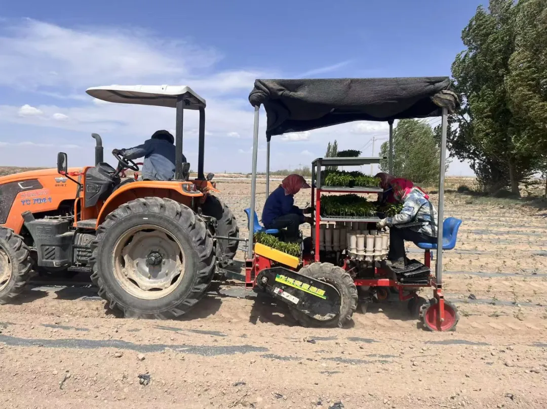 长城村田野上,辣椒移栽机正在有序进行辣椒种植,极大地提升了辣椒苗种植的速度与效率。