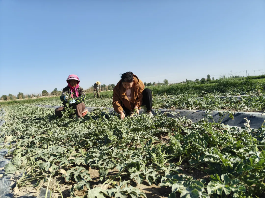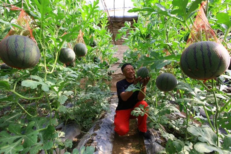 拥有全国农产品地理标志的野麻湾村西瓜即将迎来丰产季,农户正在给西瓜进行授粉、掐条。