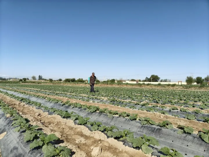 长城村农户正在给制种西葫芦喷洒叶面肥