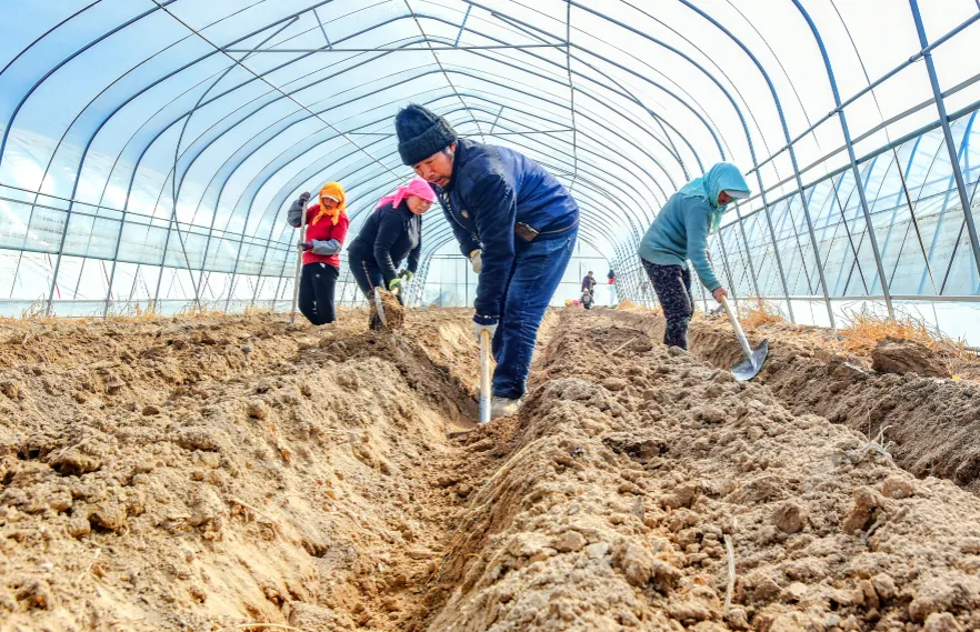 图为文殊镇农户为今年首次种植的大棚土豆开沟起垄。