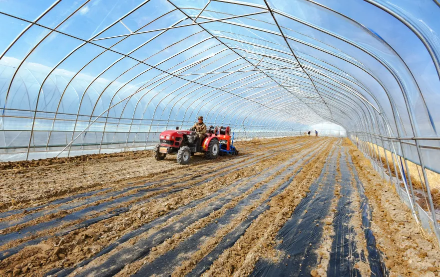 图为文殊镇石桥村农户为钢架设施大棚铺设地膜。