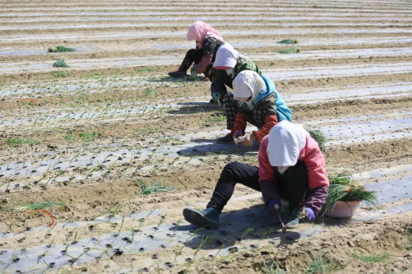 3月30日,新城镇长城村农民组团抢墒移栽洋葱。