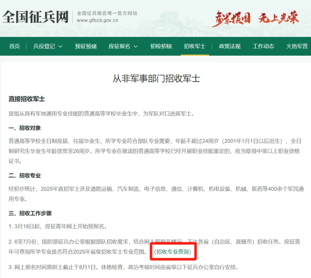 每年3月,全国征兵网会开启直招军士预报名通道,应征青年可查询自己的专业是否符合全国预招收专业,符合的青年则可以参与直招军士预报名。