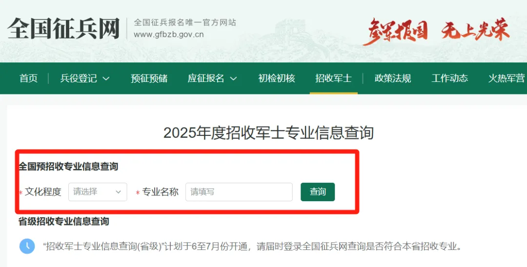 注意:“省级招收军士专业信息查询”计划于6至7月份开通,届时可登录全国征兵网查询是否符合本省招收专业