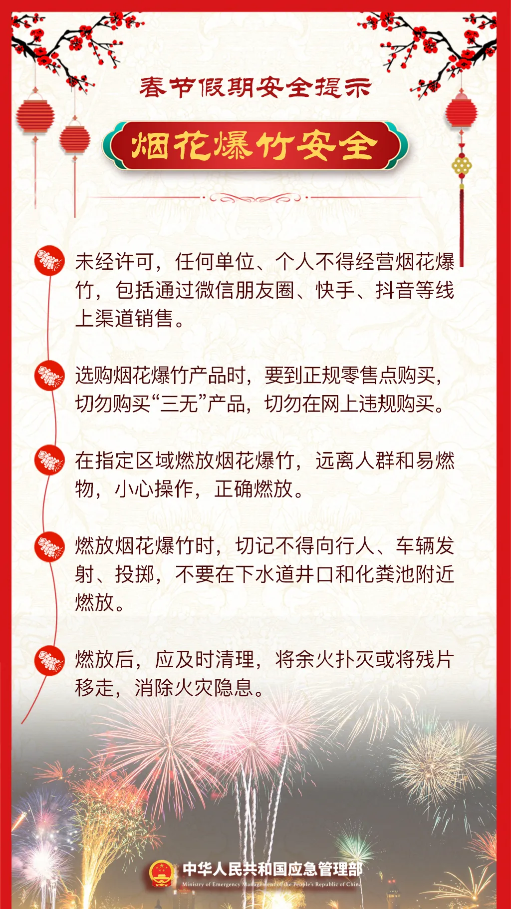 春节假期将至,家庭用火用气用电增加,自驾出行、客货运输增多,灯会、庙会、促销庆典等大型活动多,宾馆饭店客流剧增,煤炭等企业保供压力加大,叠加低温雨雪天气,各类安全风险增加,这份春节假期安全提示,请查收!