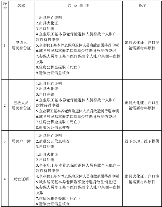 (二)推动线上“一网通办”。依托甘肃政务服务网和“甘快办”移动端“高效办成一件事”重点事项服务专区统一办事入口,优化整合业务办理流程,将企业职工基本养老保险退休人员身故个人账户一次性待遇申领、企业职工基本养老保险退休人员身故遗属待遇申领、城乡居民基本养老保险享受待遇身故注销登记、参保人员职工基本医疗保险个人账户余额一次性支取、住房公积金提取(死亡)、户口注销、驾驶证注销、遗嘱公证信息核查、已故人员股权登记信息查询(继承人查询)、已故人员社保卡信息等全部纳入全省一体化政务服务平台办理。(省公安厅、省民政厅、省司法厅、省人社厅、省住建厅、省卫生健康委、省市场监管局、省医保局、省大数据中心、甘肃金融监管局按照职责分工负责)