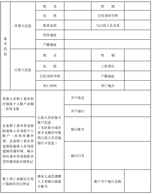 (一)做好前期基础工作。全面梳理个人身后“一件事”涉及单事项要素信息,厘清各部门职责权限,优化办事流程,编制办事指南,精简办事材料。根据梳理形成的个人身后“一件事”申请表(详见附件1)和资料清单(详见附件2),对群众提交线上可办的联办申请,通过数据共享自动匹配用户信息,实现办事申请表单智能预填、材料自动核验及业务协同审批。加快“甘肃省人社公共服务平台”“甘肃省医保公共服务平台”“甘肃省住房公积金区域一体化共享协同平台”等业务平台与全省一体化政务服务平台对接,及时推送相关信息,实现死亡证明、火化证明、遗嘱公证、继承公证、社保医保提取、住房公积金提取、小额存款提取等业务数据互联互通。(省公安厅、省民政厅、省司法厅、省人社厅、省住建厅、省卫生健康委、省市场监管局、省医保局、省大数据中心、甘肃金融监管局按照职责分工负责,各市州人民政府、甘肃矿区办事处、兰州新区管委会落实。以下措施均需各市州人民政府、甘肃矿区办事处、兰州新区管委会落实,不再一一列出)