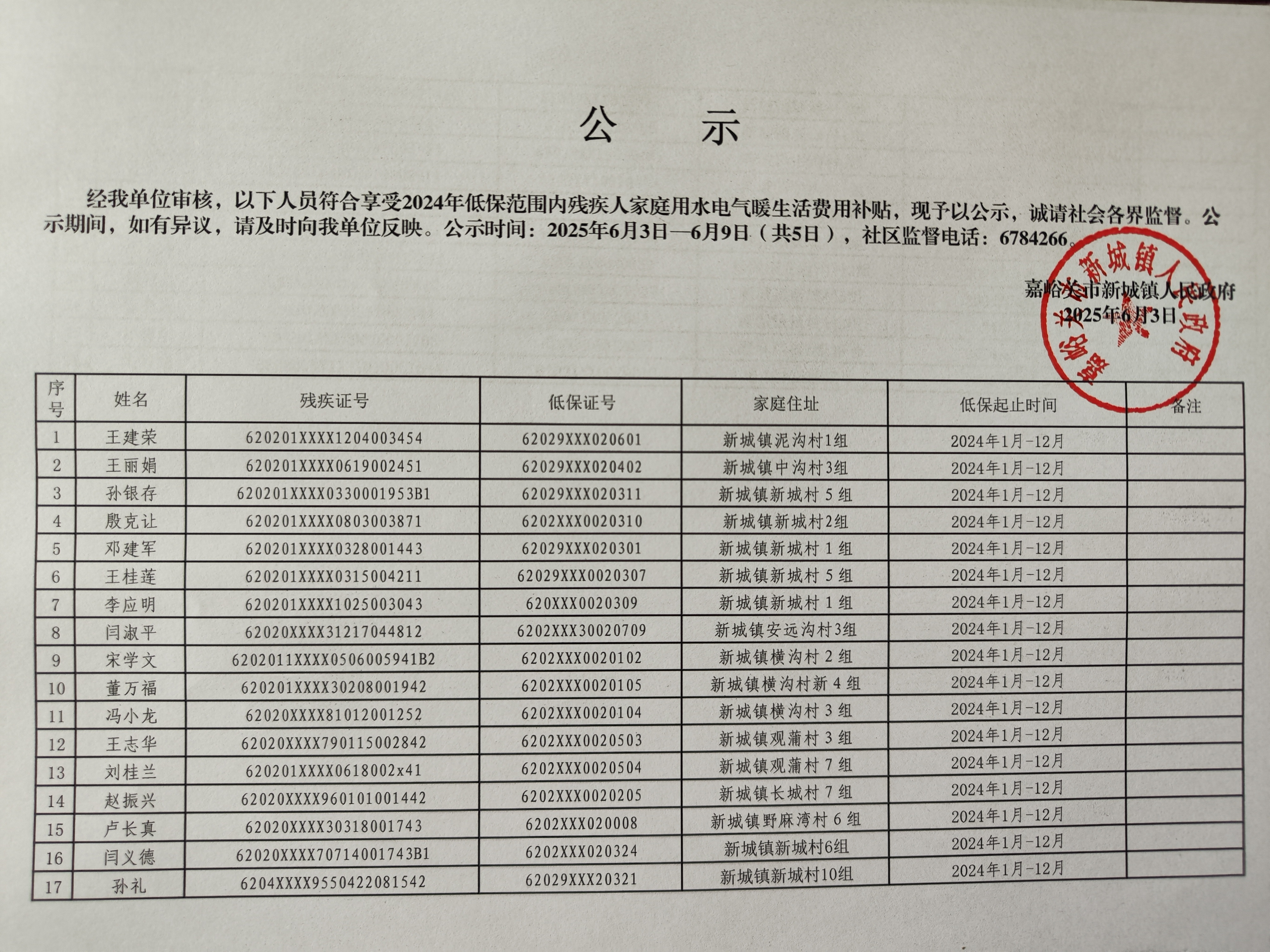 新城镇低保范围内残疾人家庭用水电气暖生活费用补贴公示