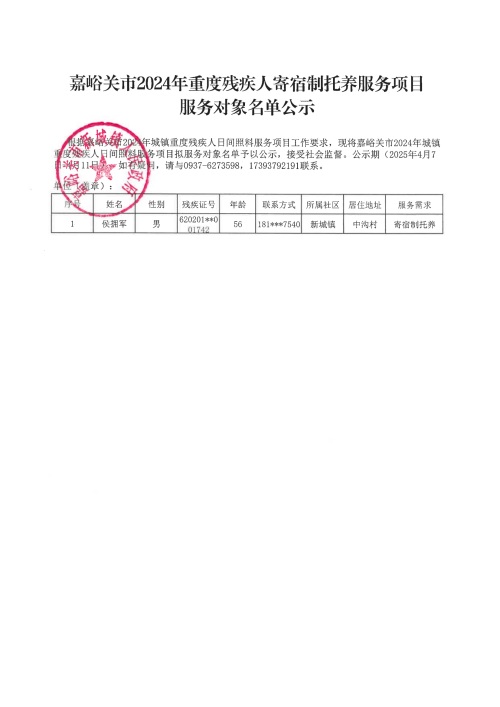 嘉峪关市2024年重度残疾人寄宿制托养服务项目服务对象名单公示