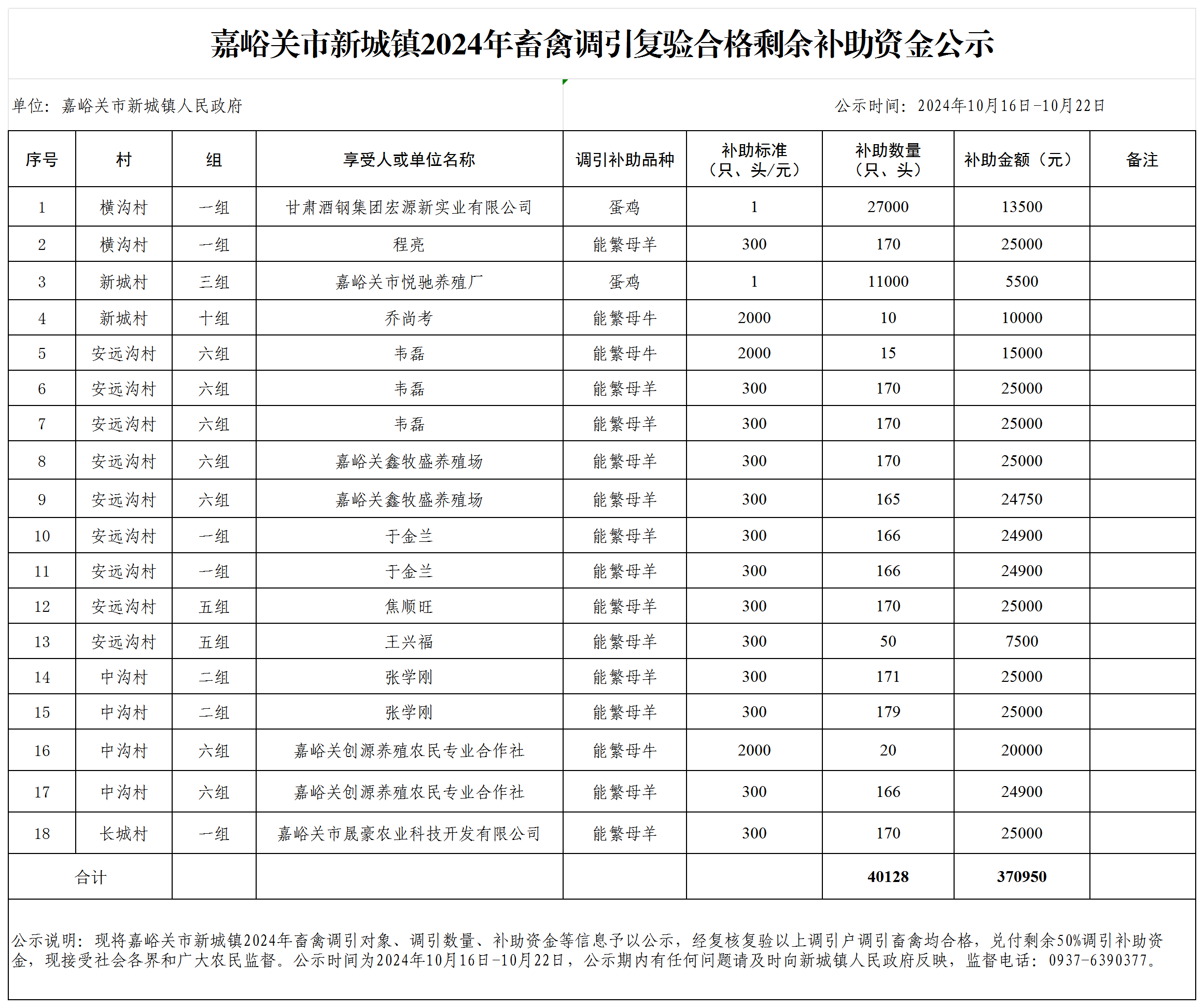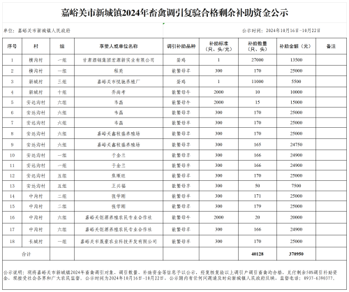 新城镇2024年畜禽调引补助公示(第二批)