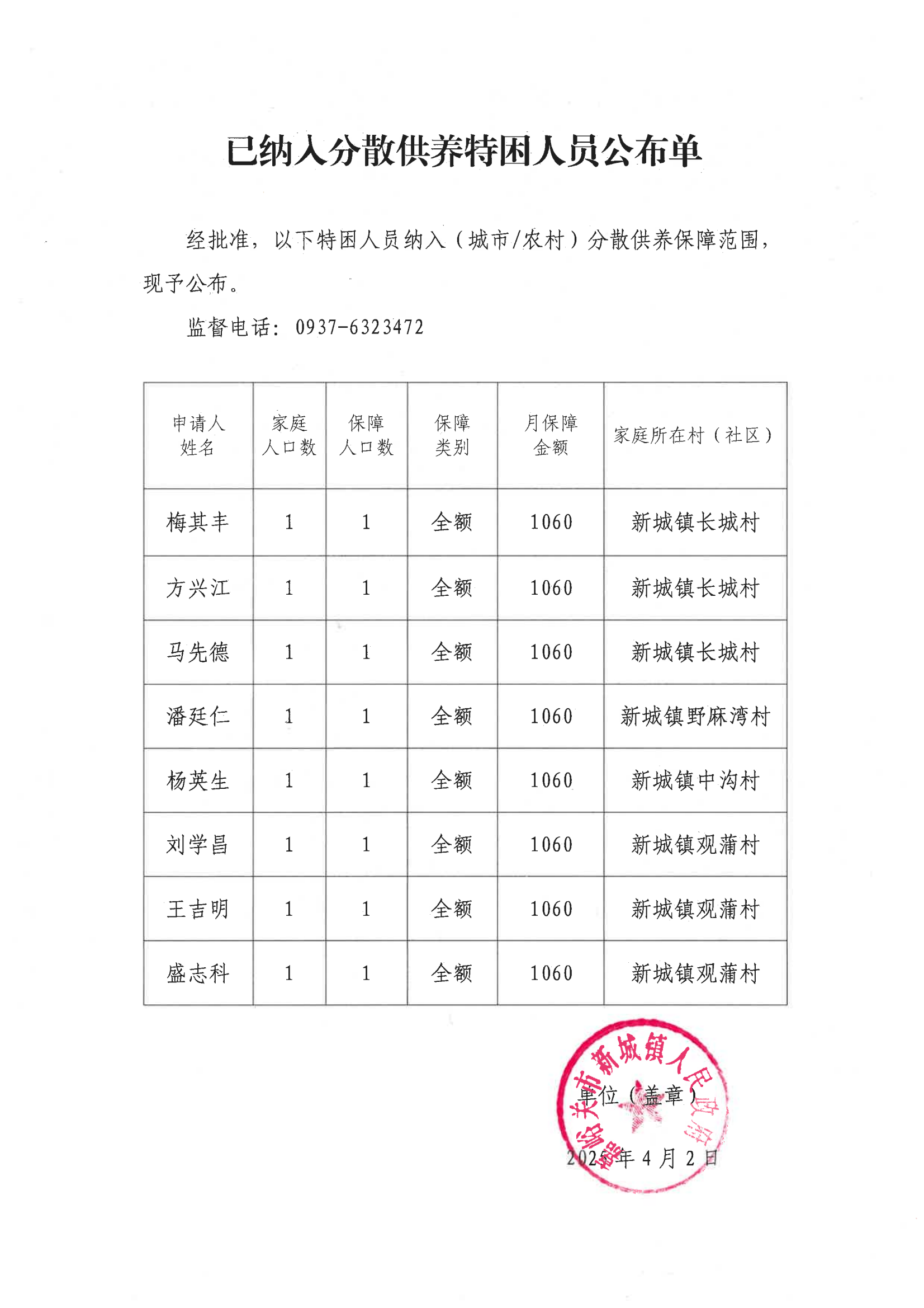 新城镇2025年4月已纳入分散供养特困人员公布单