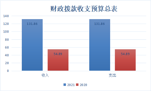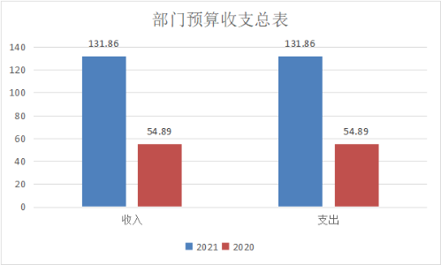 嘉峪关市新城镇社会事务综合服务中心2021年度部门预算总收入131.86万元,比上年增加76.97万元,增长58.37%;总支出131.86万元,比上年增加76.97万元,增长58.37%;。图1:预算收支总体情况(单位:万元)