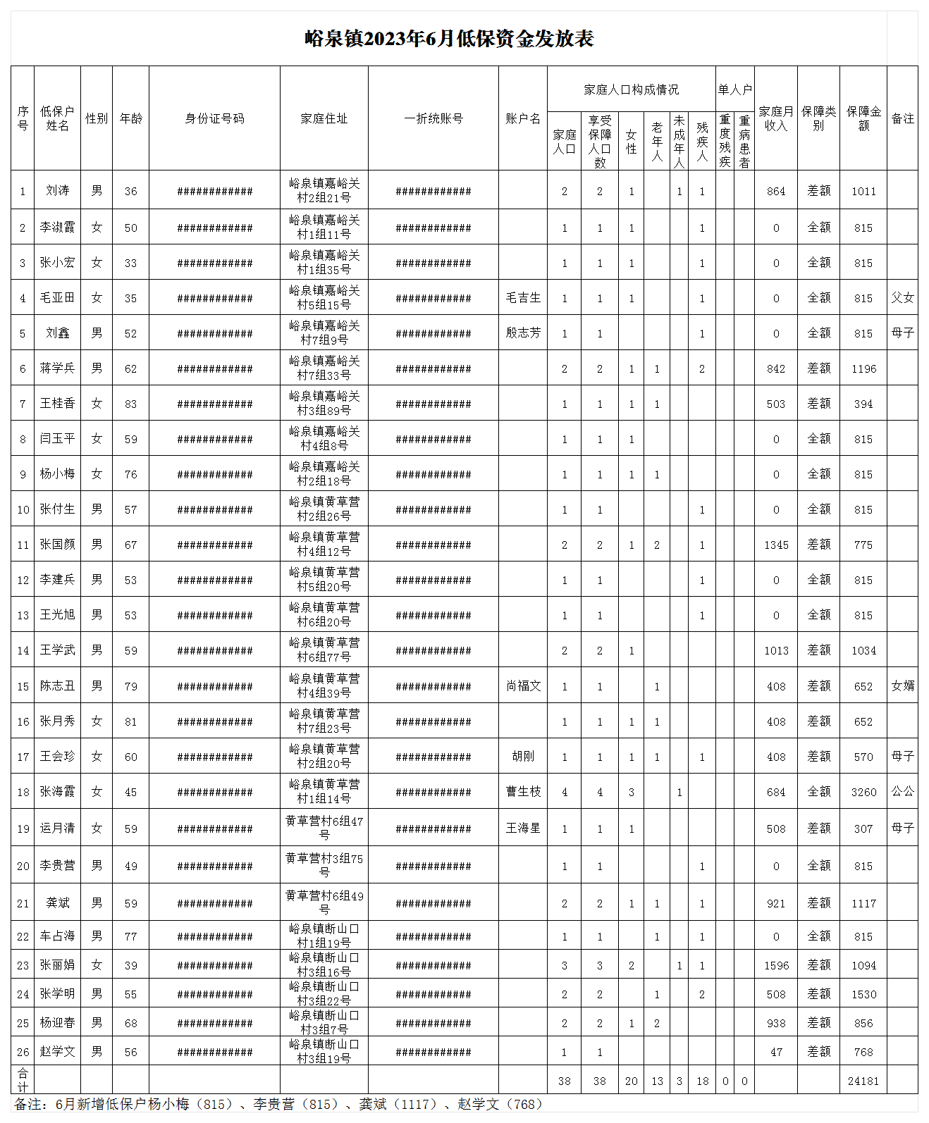 峪泉镇2023年6月低保资金发放情况公示