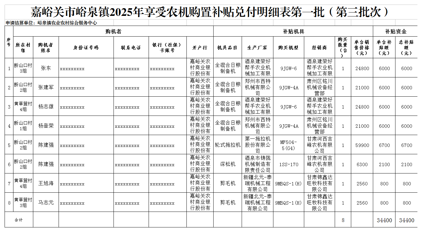 2025年峪泉镇农机购置补贴资金发放表第一批第三批次