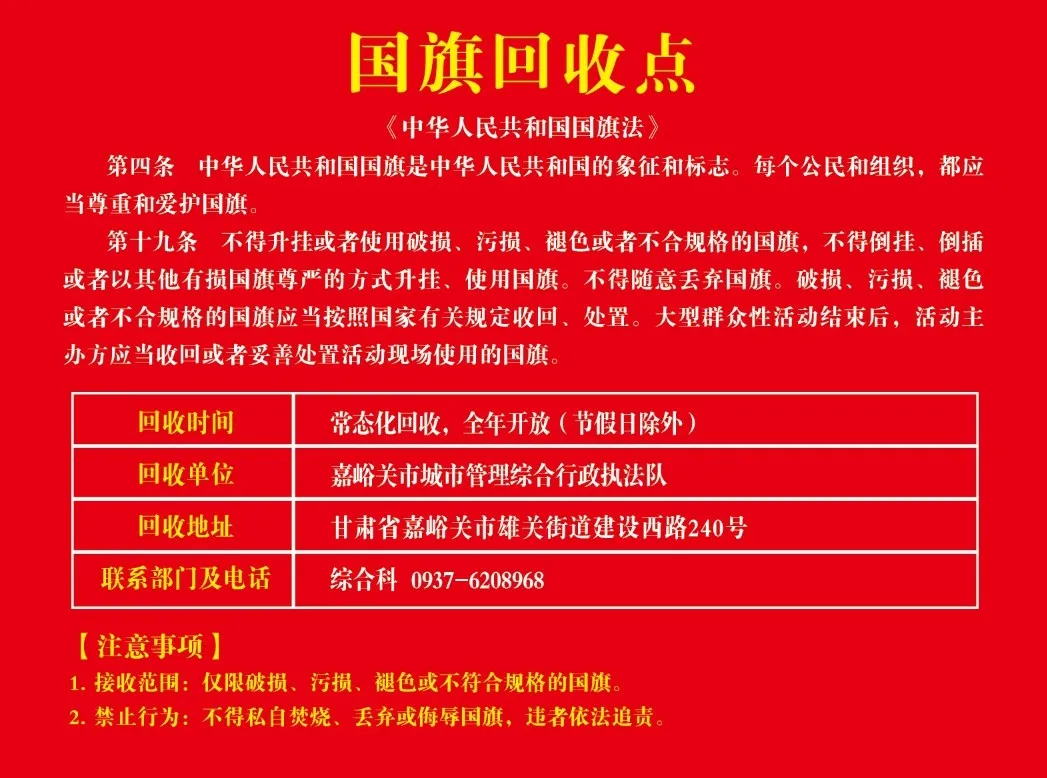 现在全市范围内常态化开展破损、污损、褪色或不合规格国旗回收工作。