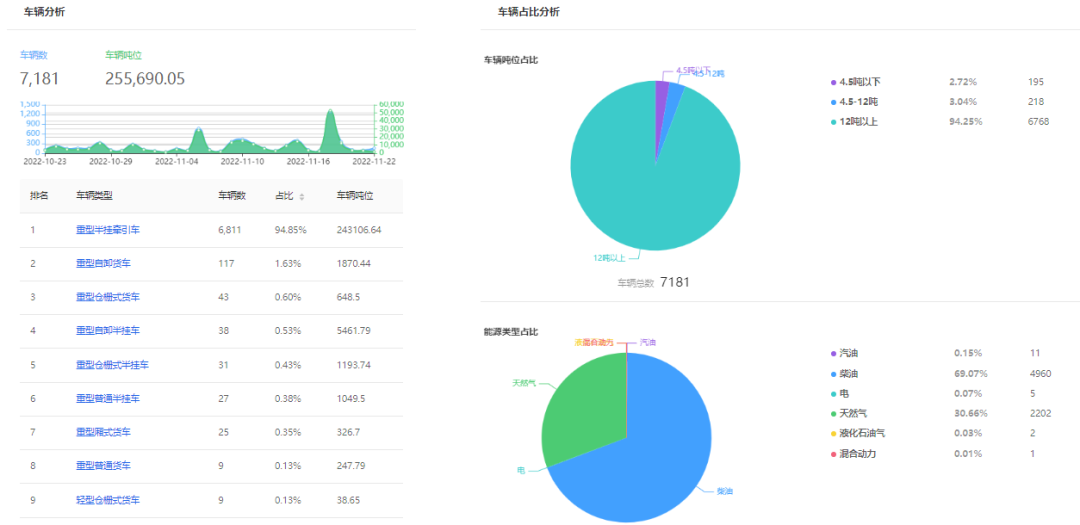 业务分析功能主要以运力、托运人、货物类型等不同方面的基础数据为切入点,从不同维度展开统计分析,并以图形和列表的方式展示,给企业和行业管理部门直观、清晰地呈现出统计期内的各项数据占比情况。目前已经上线了运力分析、货物类型分析、支付类型分析、托运人分析、实际承运人分析和异常类型分析等六项数据统计分析功能,企业可随时登录甘肃省网络货运经营信息监测平台在运行监测模块【业务分析】功能中查看数据分析结果。
