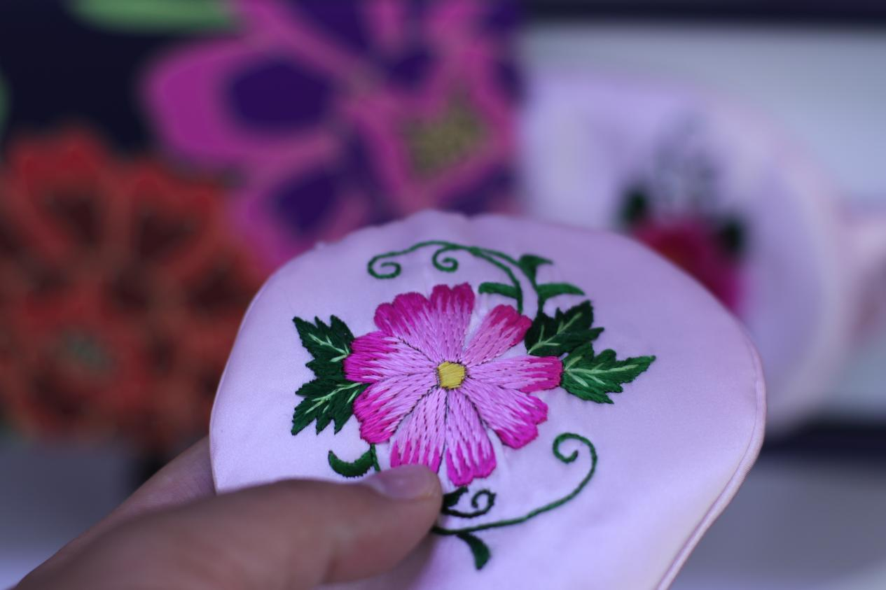 然而,在试验过程中,传统洮绣都是采用粗麻线在棉麻面料上绣制,而眼罩由于贴合人体皮肤,所以往往采用真丝,想在眼罩这么小的面料上绣出精美洮绣图案难度很大。有人说“尕马,算了吧,这个事情不好做,我们还是好好做种养殖业吧”。但是,马彦军和绣娘们孜孜不辍,始终没有放弃。