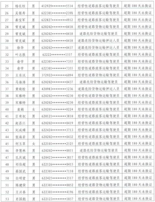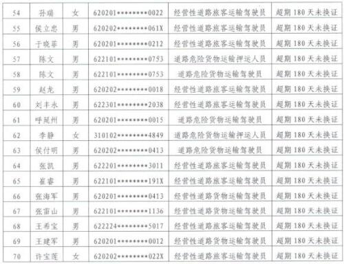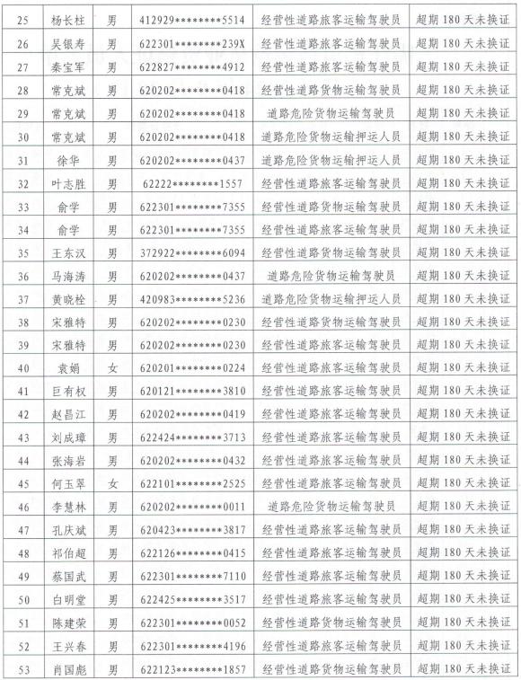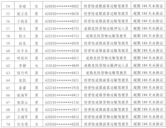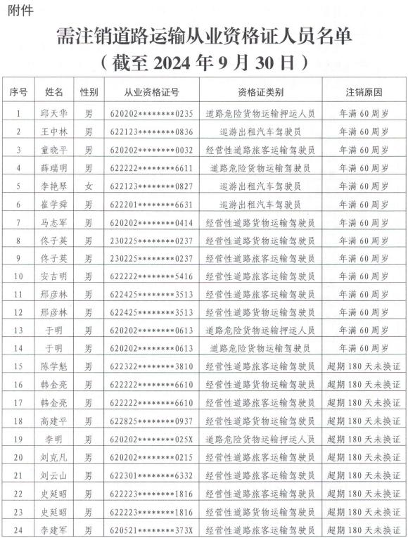 根据《道路运输从业人员管理规定》(中华人民共和国交通运输部令2022年第38号)第三十二条第三款、第三十二条第五款及《出租汽车驾驶员从业资格管理规定》(中华人民共和国交通运输部令2021年第15号)第三十八条第三款规定,现对邱天华等70名道路运输从业人员(名单见附件)从业资格证予以注销,其从业资格证自公告之日起作废。详细情况请登录嘉峪关市交通运输局官网http://www.jyg.gov.cn/jtysj/查询。