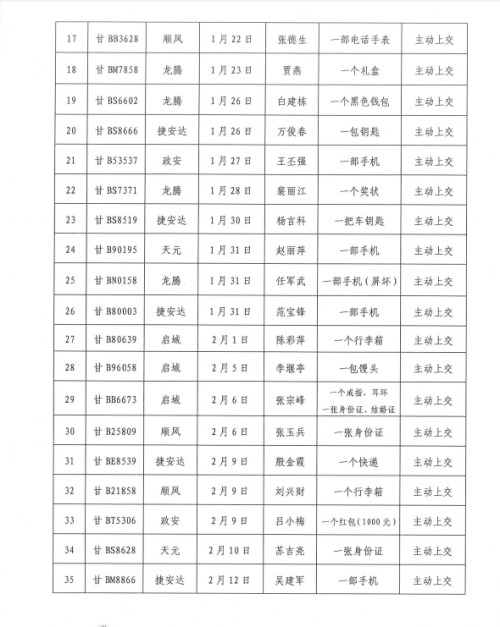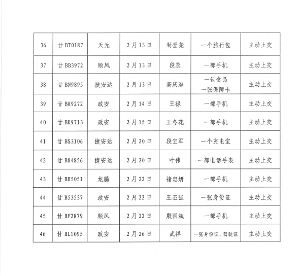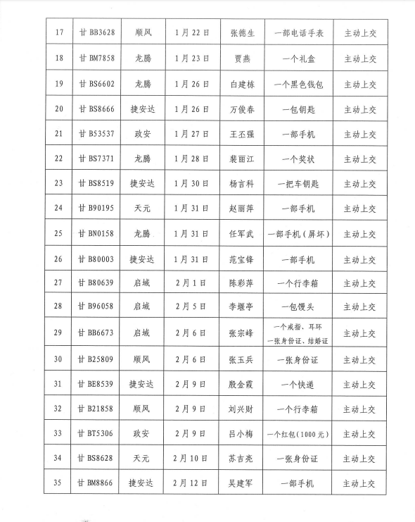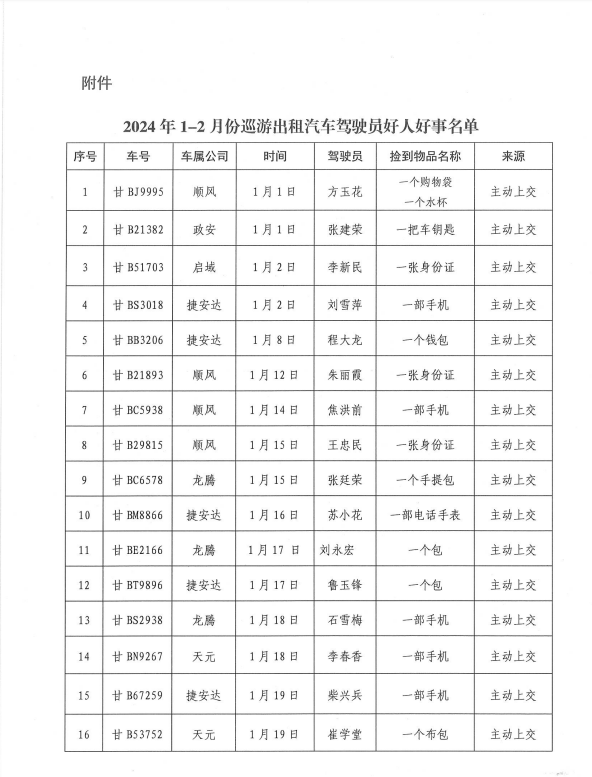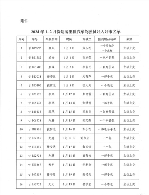 经统计,2024年1至2月期间,我市出租车驾驶员拾金不昧等好人好事多达46件,充分体现了我市出租车驾驶员的良好道德风尚和职业操守,充分展示了我市出租车行业城市名片和窗口形象,为促进行业规范管理,提升出租汽车服务质量奠定了坚实的基础和积极向好的带动作用。为表彰先进,弘扬新风,经研究决定,对方玉花、张建荣等46名拾金不昧的“的哥、的姐”予以全行业通报表扬。(详见附件)