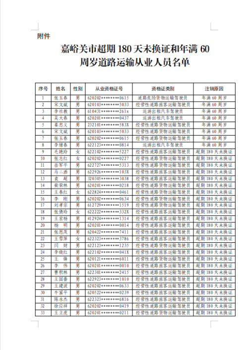关于注销超期180天未换证和年满60周岁道路运输从业人员从业资格证的公告