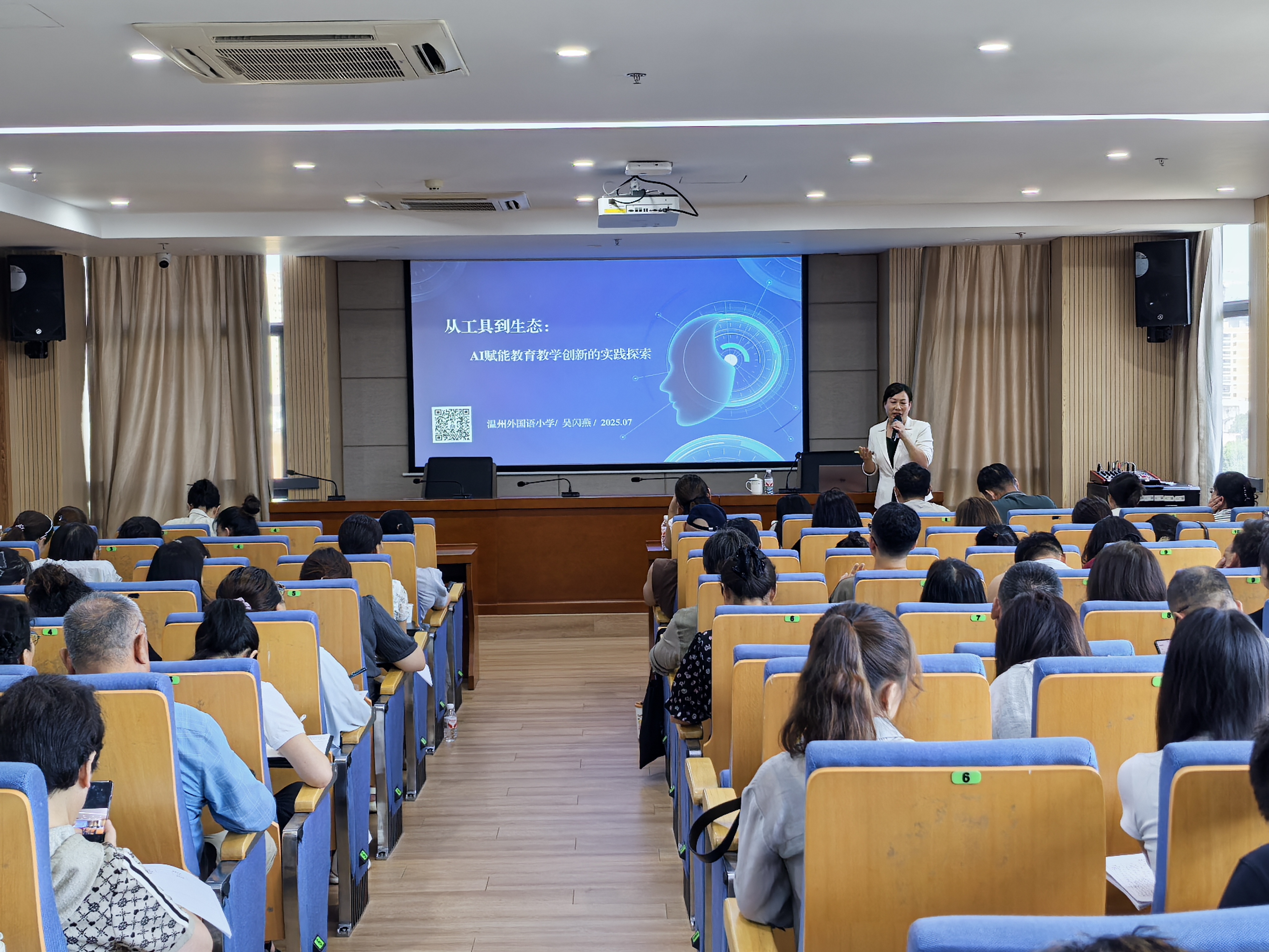 14日下午,温州市名校长、名班主任吴闪燕做了题为《从工具到生态:AI赋能学校教育教学创新的实践探索》的报告。吴校长深入剖析了人工智能在教育领域的应用现状与未来发展趋势,结合大量实践案例,详细介绍了如何利用AI技术创新教学模式、优化教学过程、提升教学效果,引发了参训教师对AI赋能教育的共鸣,以及对教育数字化转型的深入思考。
