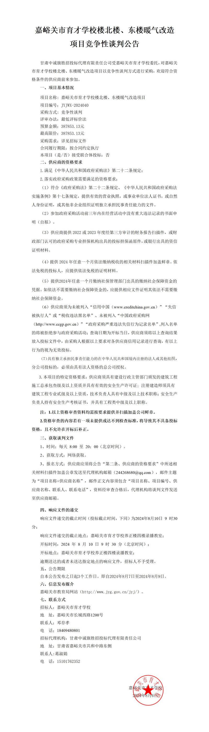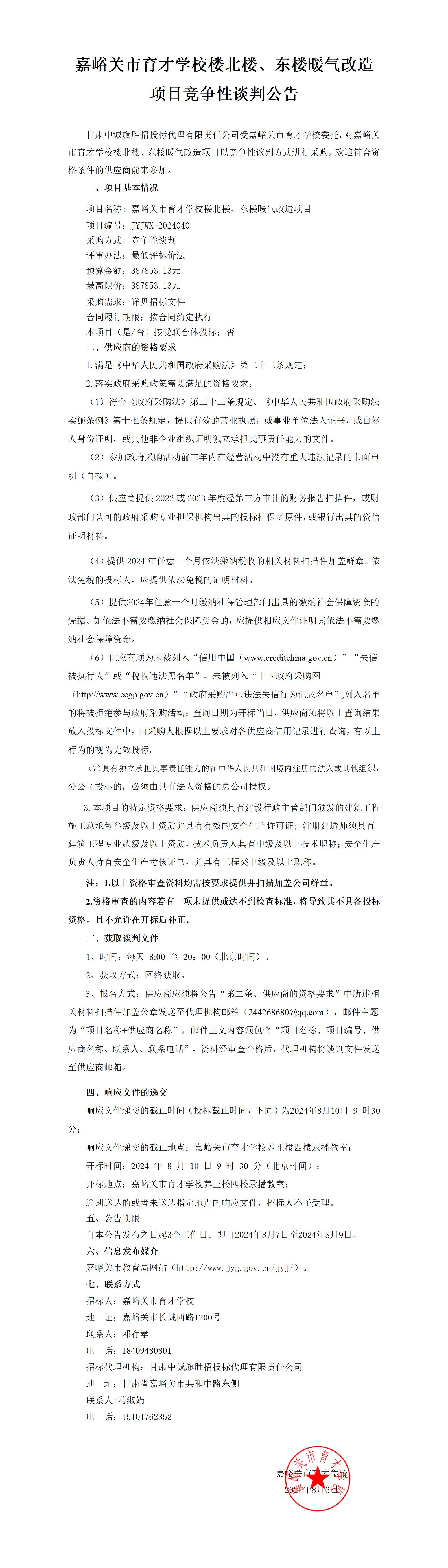 嘉峪关市育才学校楼北楼、东楼暖气改造项目竞争性谈判公告
