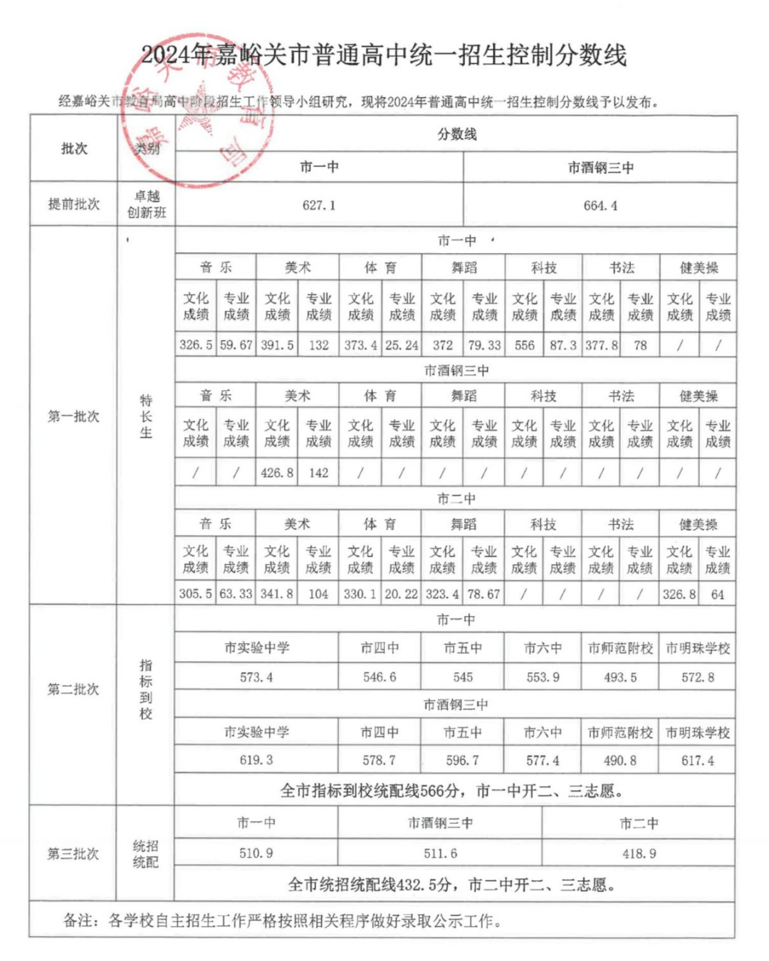 2024年嘉峪关市普通高中统一招生控制分数线公布。