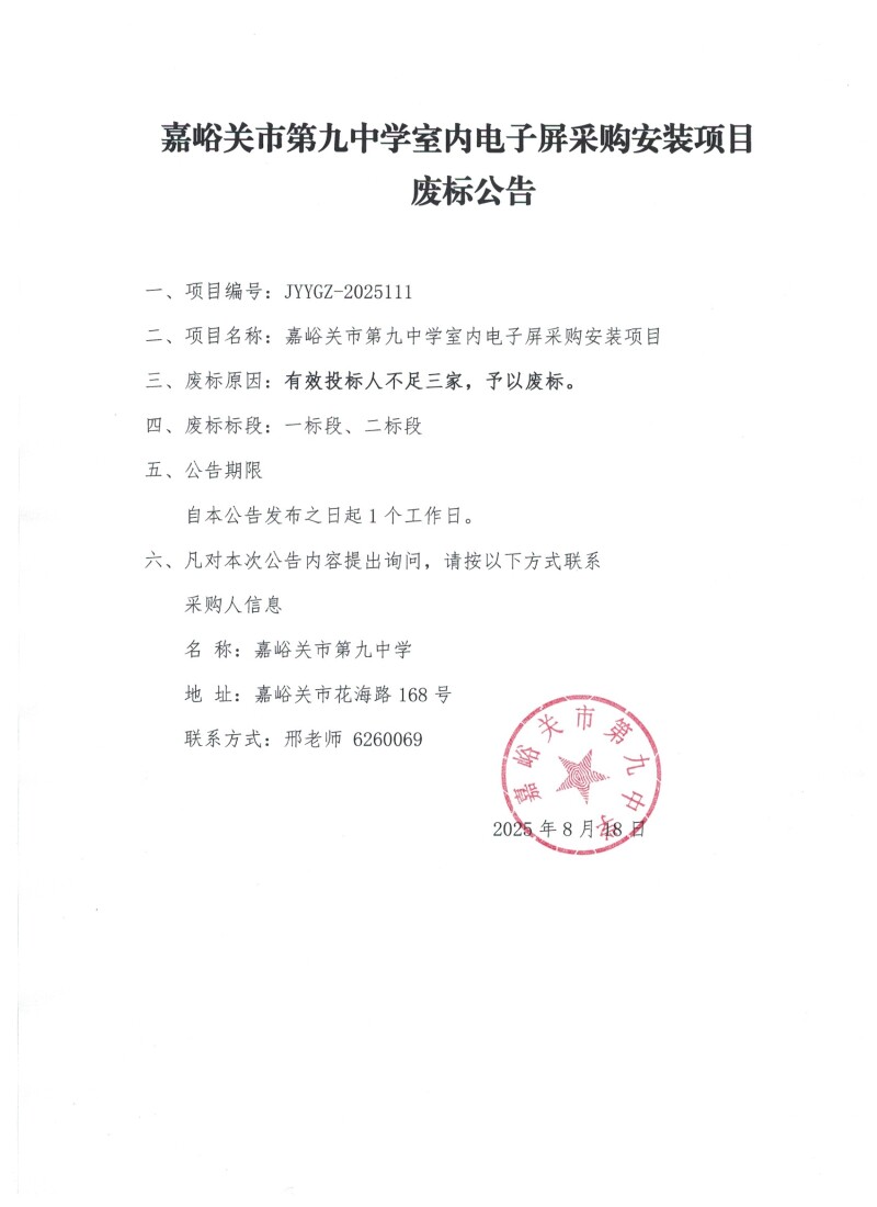 嘉峪关市第九中学室内电子屏采购安装项目废标公告