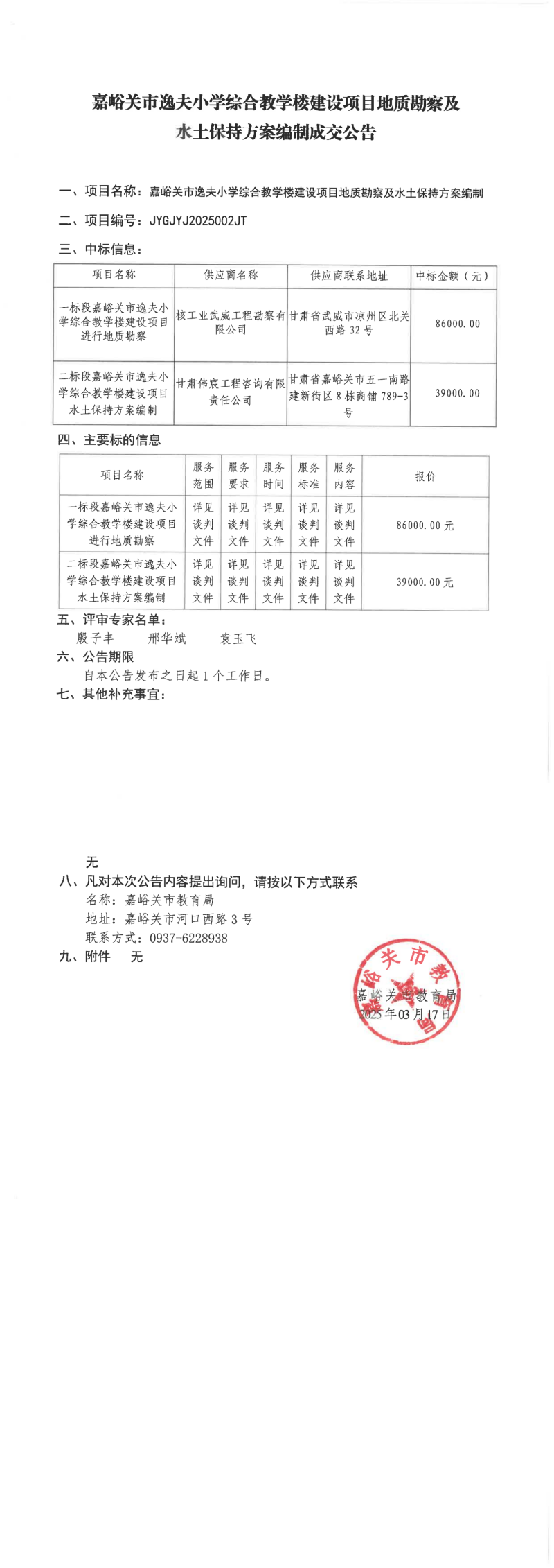 嘉峪关市逸夫小学综合教学楼建设项目地质勘查及水土保持方案编制成交公告