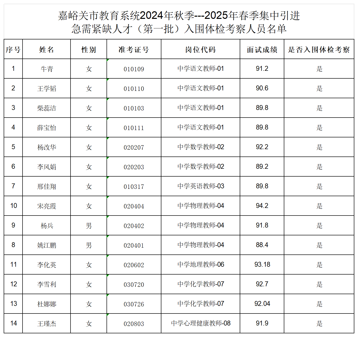 一、嘉峪关市教育系统2024年秋季---2025年春季集中引进急需紧缺人才(第一批)入围体检考察人员名单(见附件)