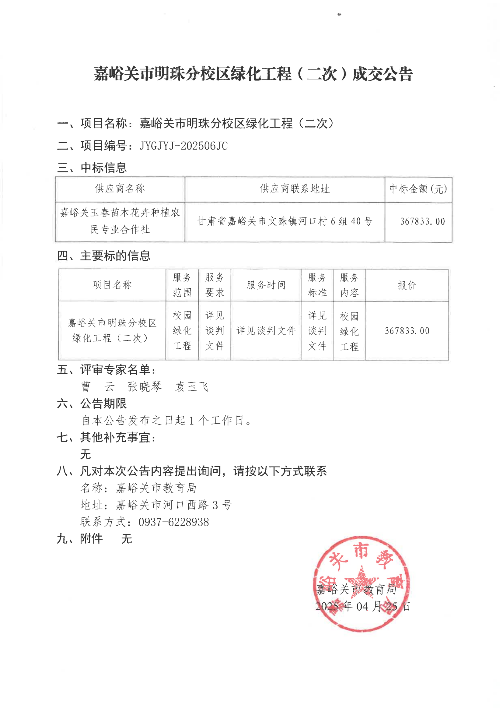 嘉峪关市明珠分校区绿化工程(二次)成交公告