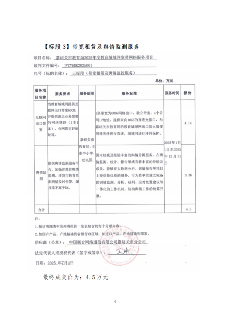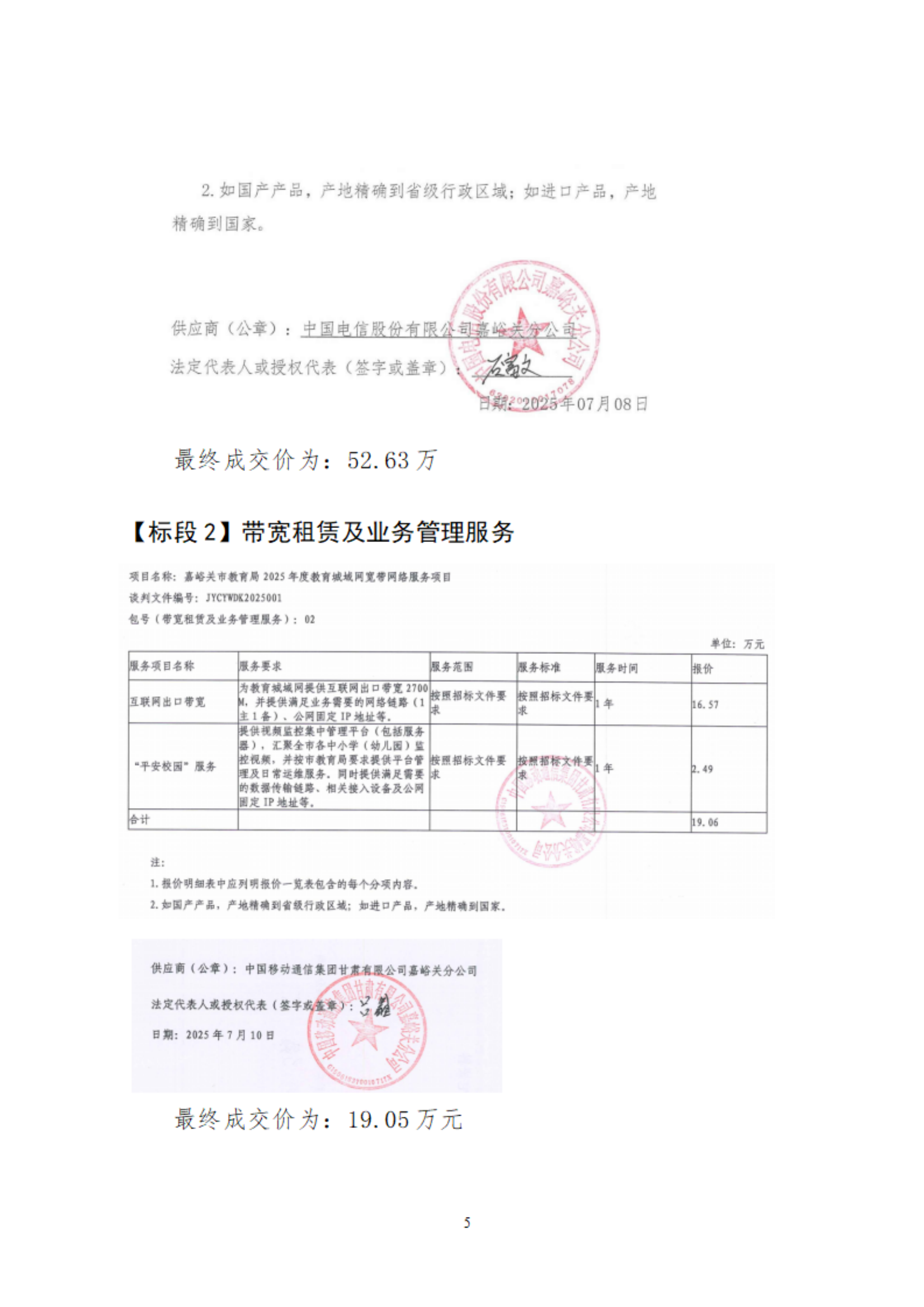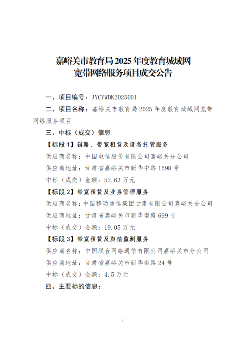 嘉峪关市教育局2025年度教育城域网宽带网络服务项目成交公告
