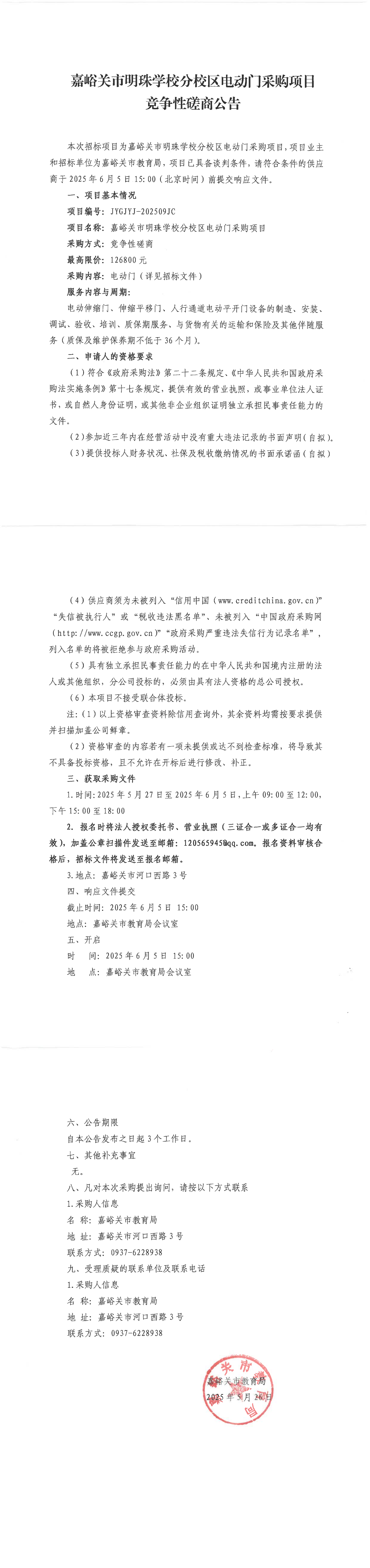 嘉峪关市明珠学校分校区电动门采购项目竞争性磋商公告
