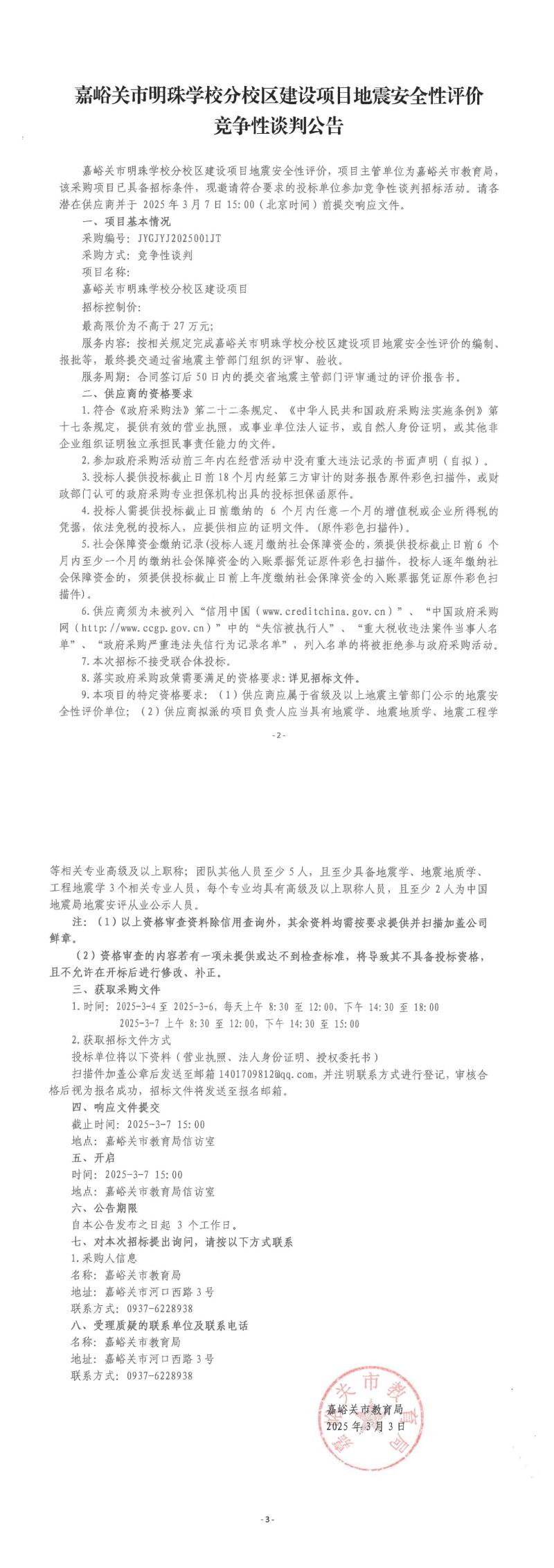 嘉峪关市明珠学校分校区建设项目地震安全性评价-竞争性谈判公告