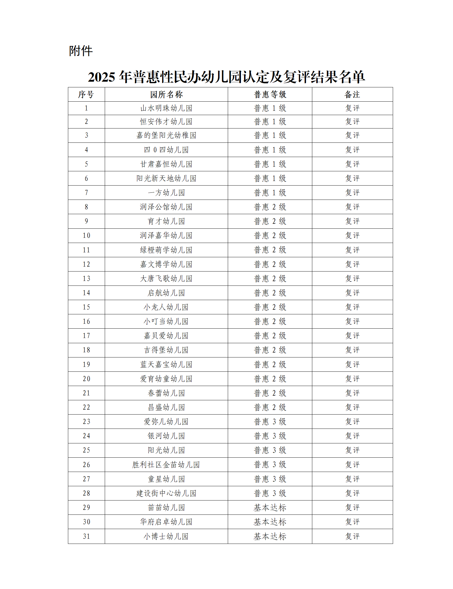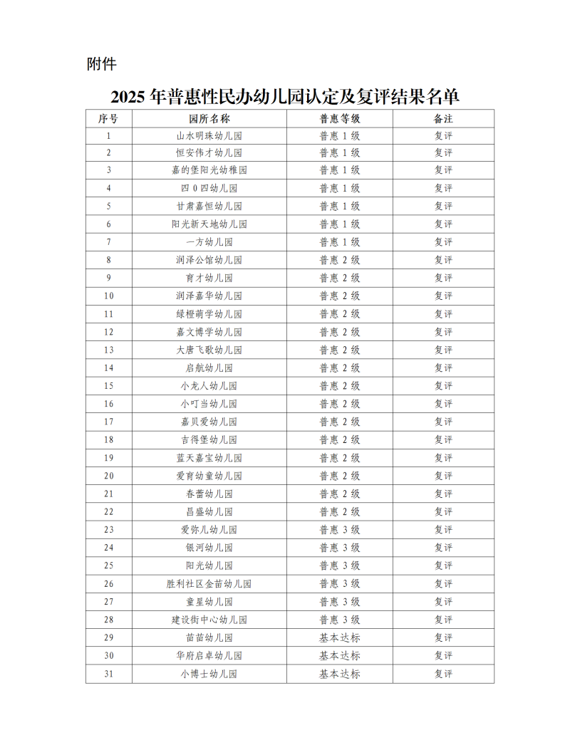 附件:2025年普惠性民办幼儿园复评结果名单