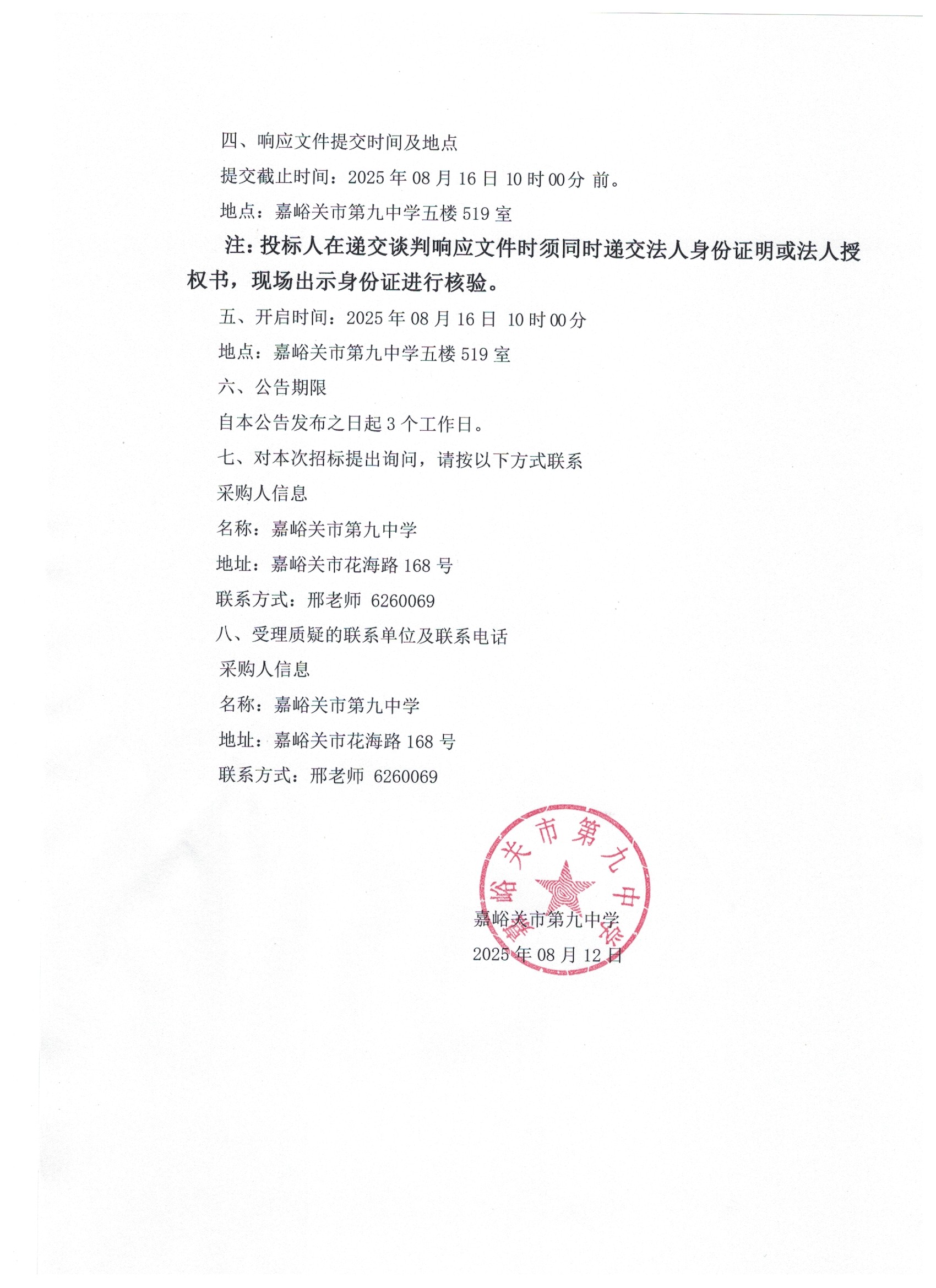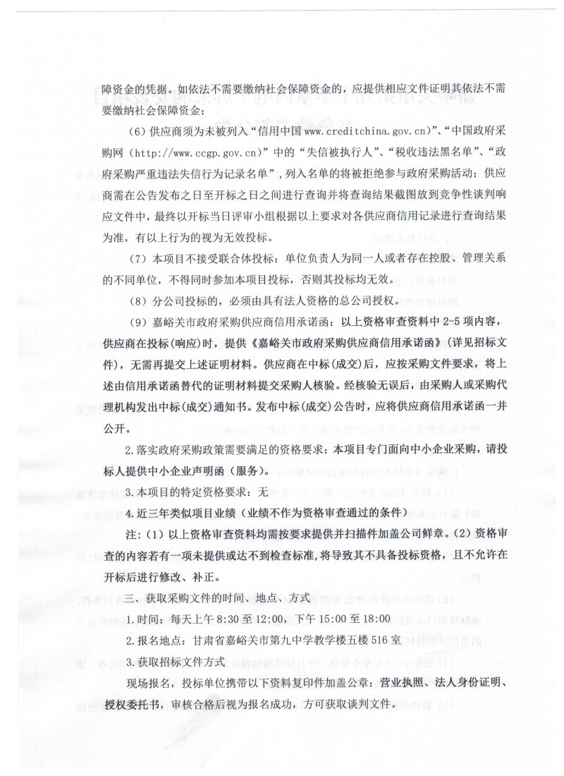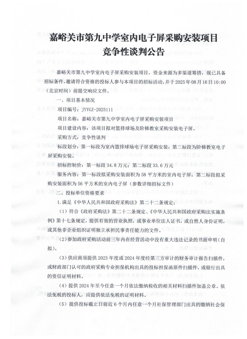 嘉峪关市第九中学室内电子屏采购安装项目竞争性谈判公告
