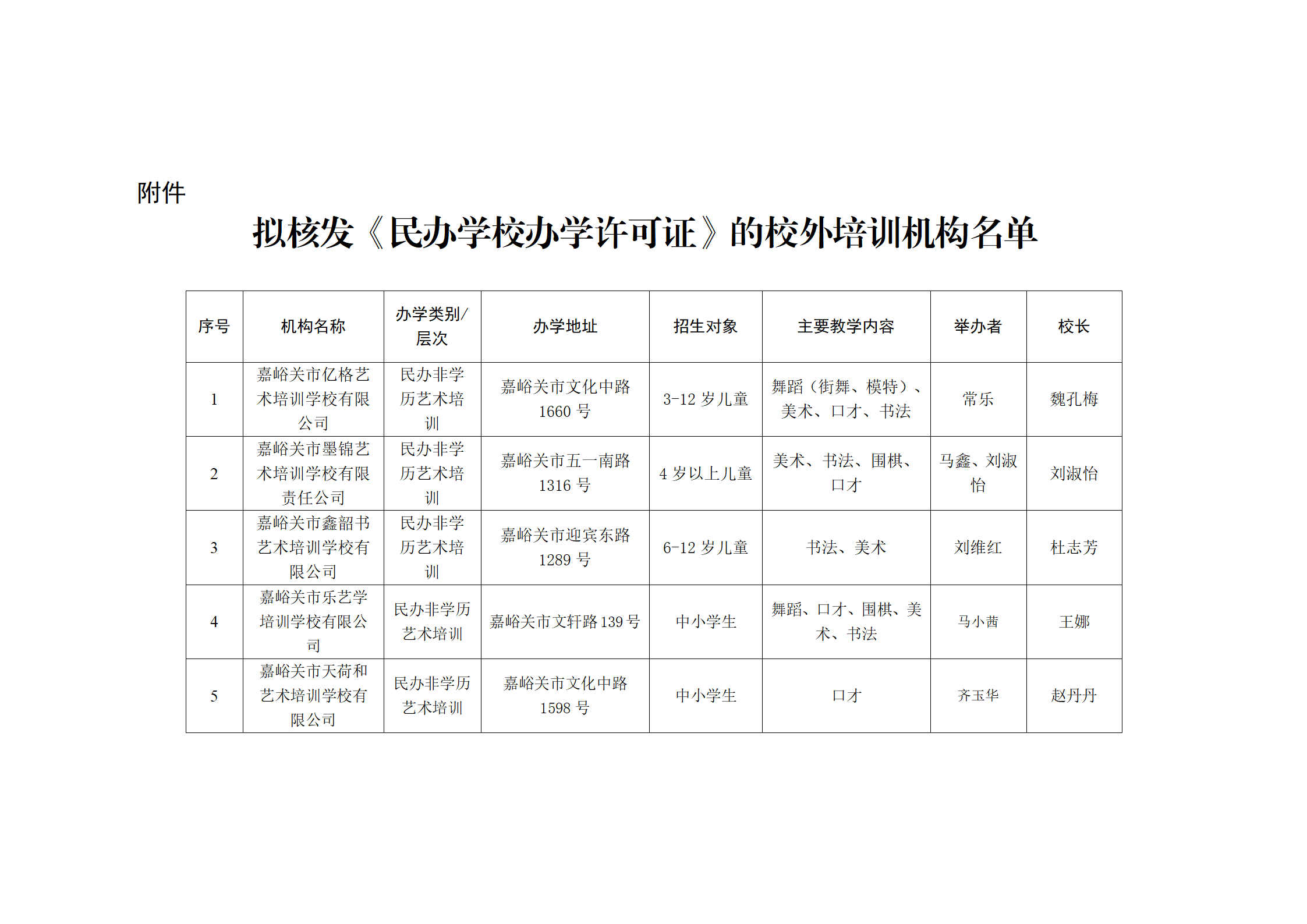 根据《中华人民共和国民办教育促进法》相关规定,市教育局对近期申报的校外培训机构进行了资料审查与现场核查。经教育局会议研究同意,拟对符合办学要求的嘉峪关市亿格艺术培训学校有限公司等5所校外培训机构核发《民办学校办学许可证》,现予以公示(具体信息附后)。公示期:2025年5月26日-5月30日,问题反映受理电话:0937-6225736。