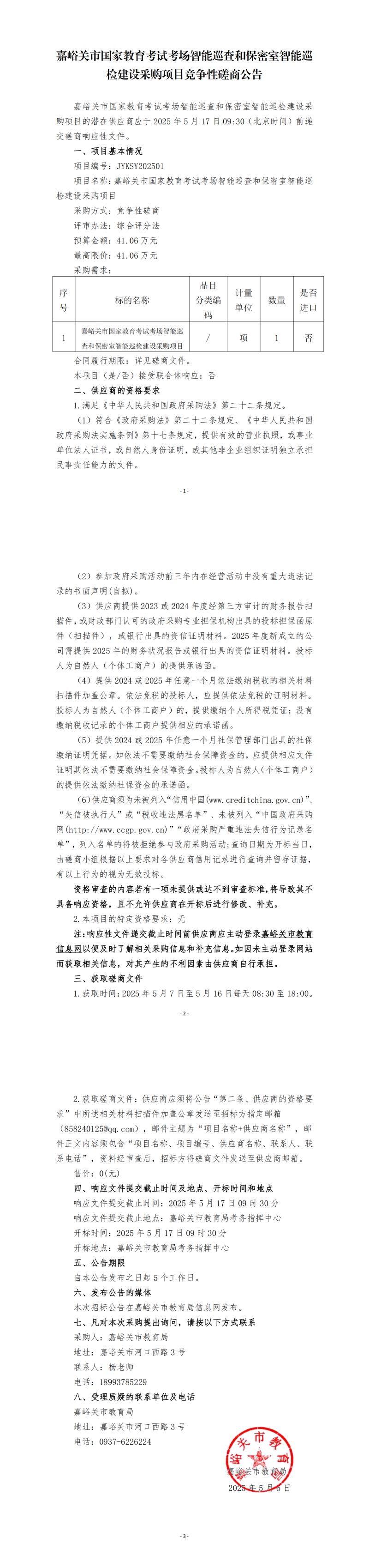 嘉峪关市国家教育考试考场智能巡查和保密室智能巡检建设采购项目竞争性磋商公告