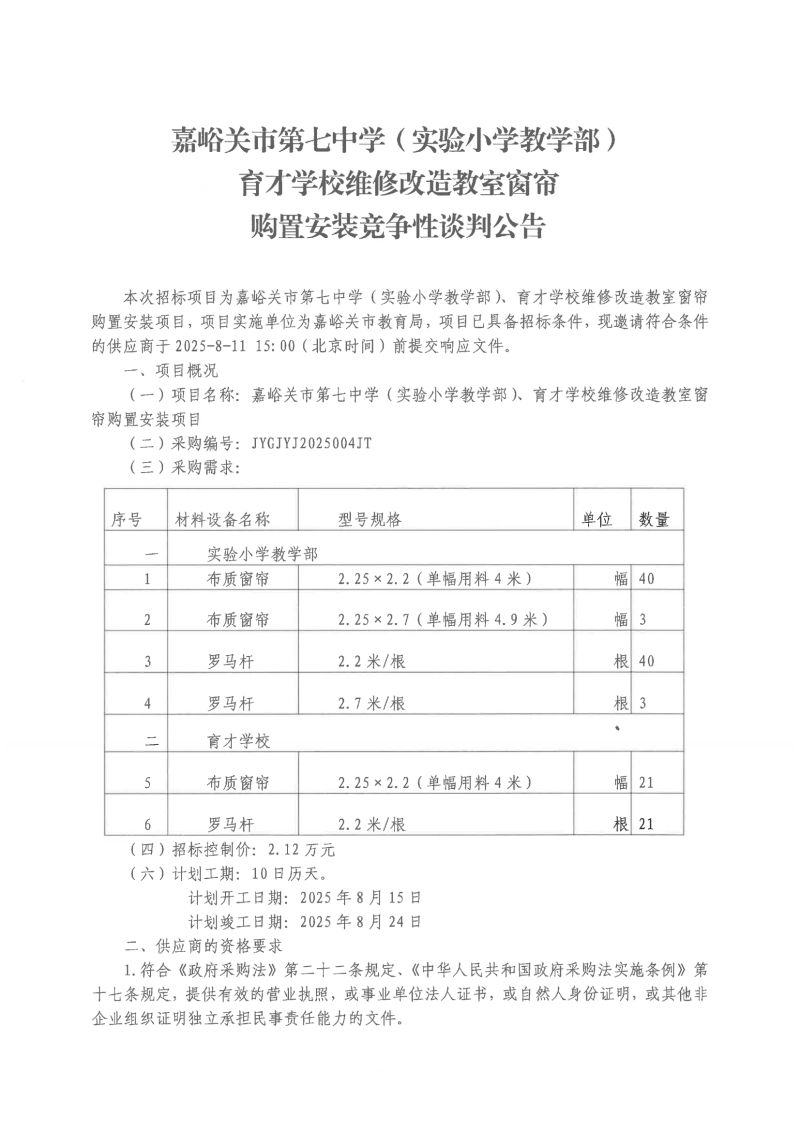 嘉峪关市第七中学(实验小学教学部)、育才学校维修改造教室窗帘购置安装项目竞争性谈判公告