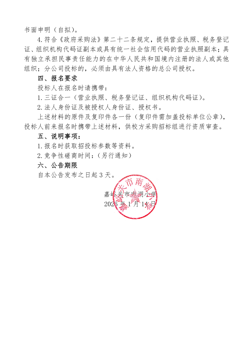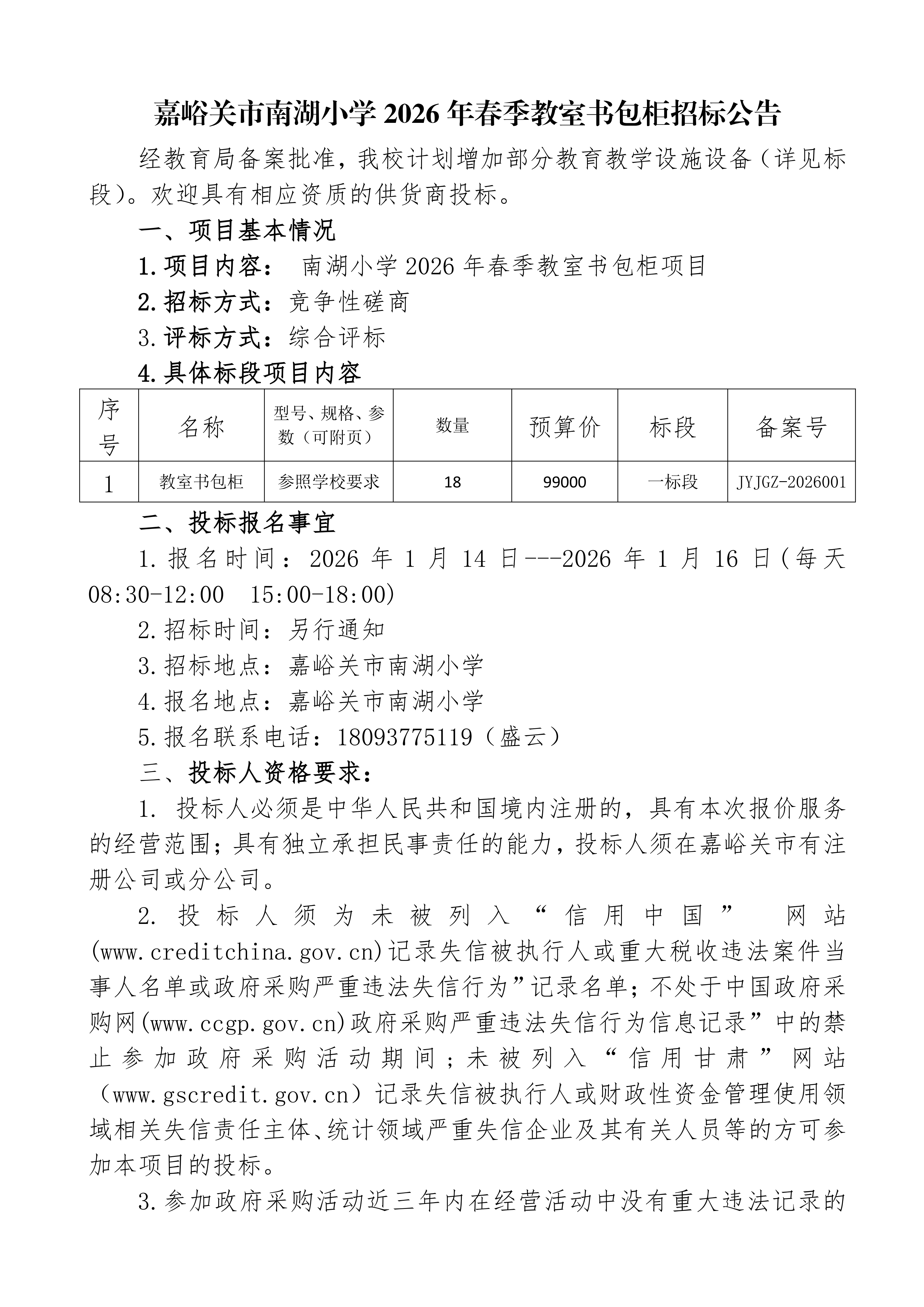 嘉峪关市南湖小学2026年春季教室书包柜招标公告