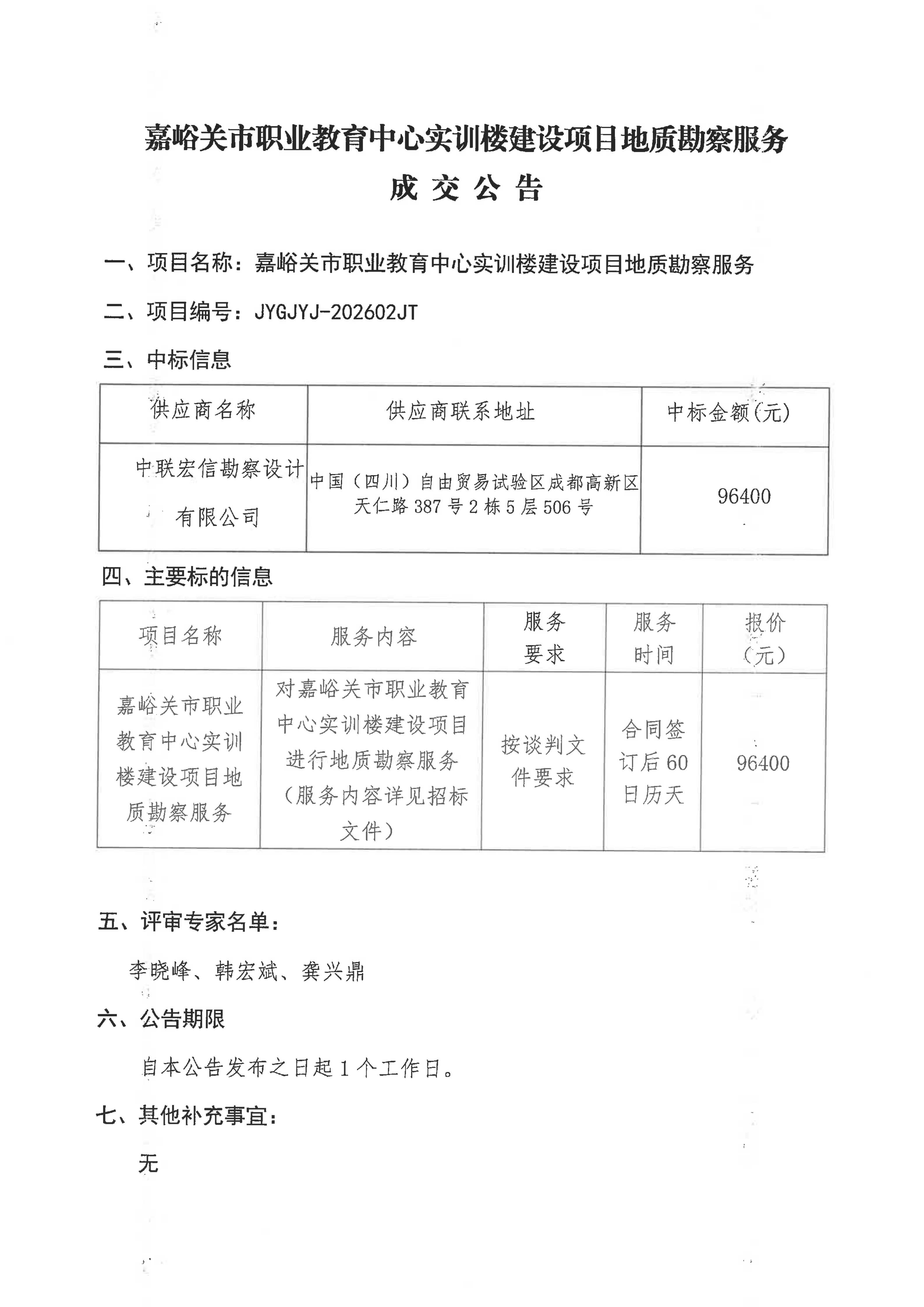 嘉峪关市职业教育中心实训楼建设项目地质勘察服务成交公告